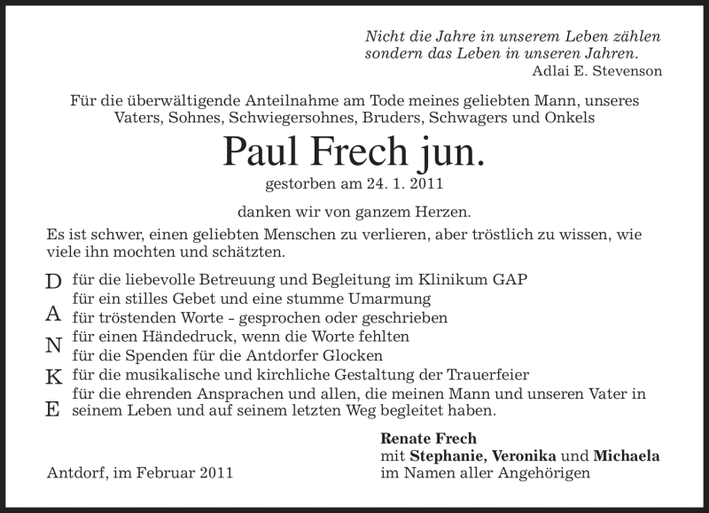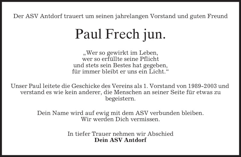 Hier finden Sie alle Traueranzeigen aus der Zeitung, die bisher für Paul Frech erschienen sind. Weitere Traueranzeigen, die in der Zeitung erscheinen, werden hier ebenfalls aufgelistet