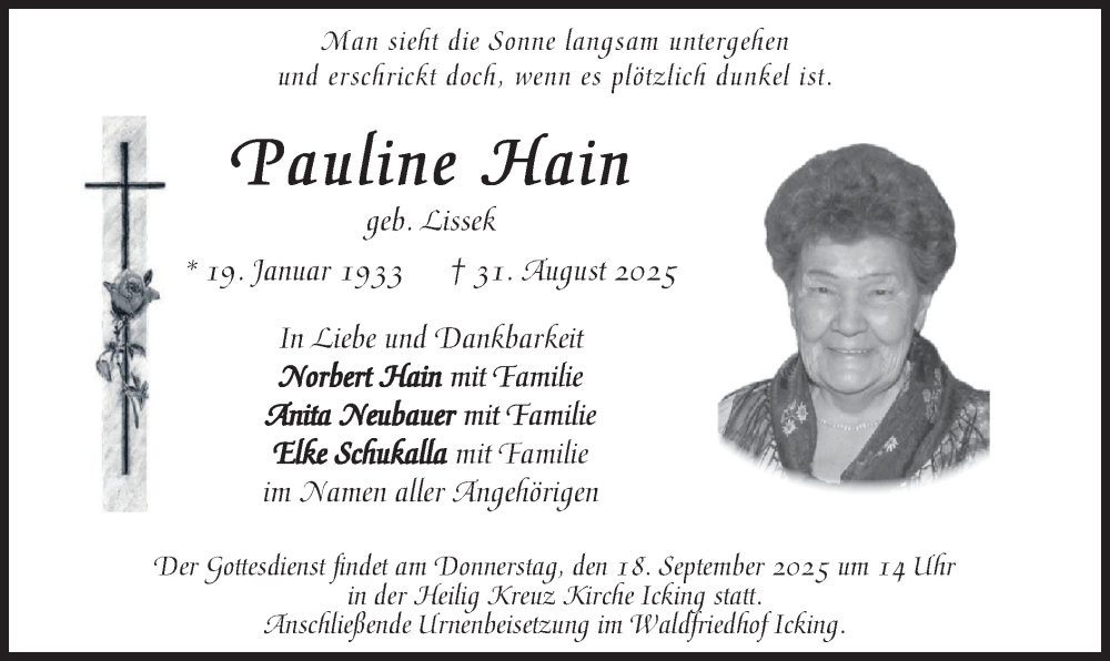 Hier finden Sie alle Traueranzeigen aus der Zeitung, die bisher für Pauline Hain erschienen sind. Weitere Traueranzeigen, die in der Zeitung erscheinen, werden hier ebenfalls aufgelistet