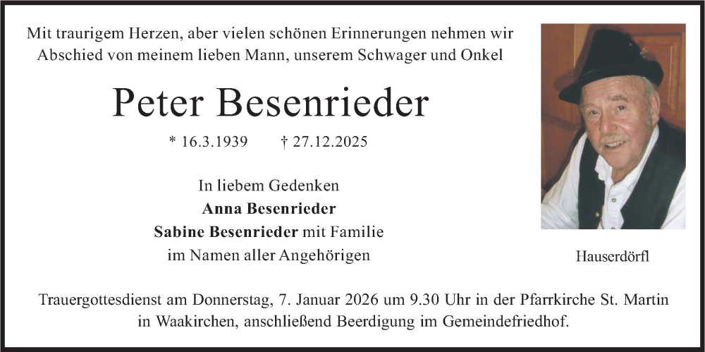 Hier finden Sie alle Traueranzeigen aus der Zeitung, die bisher für Peter Besenrieder erschienen sind. Weitere Traueranzeigen, die in der Zeitung erscheinen, werden hier ebenfalls aufgelistet
