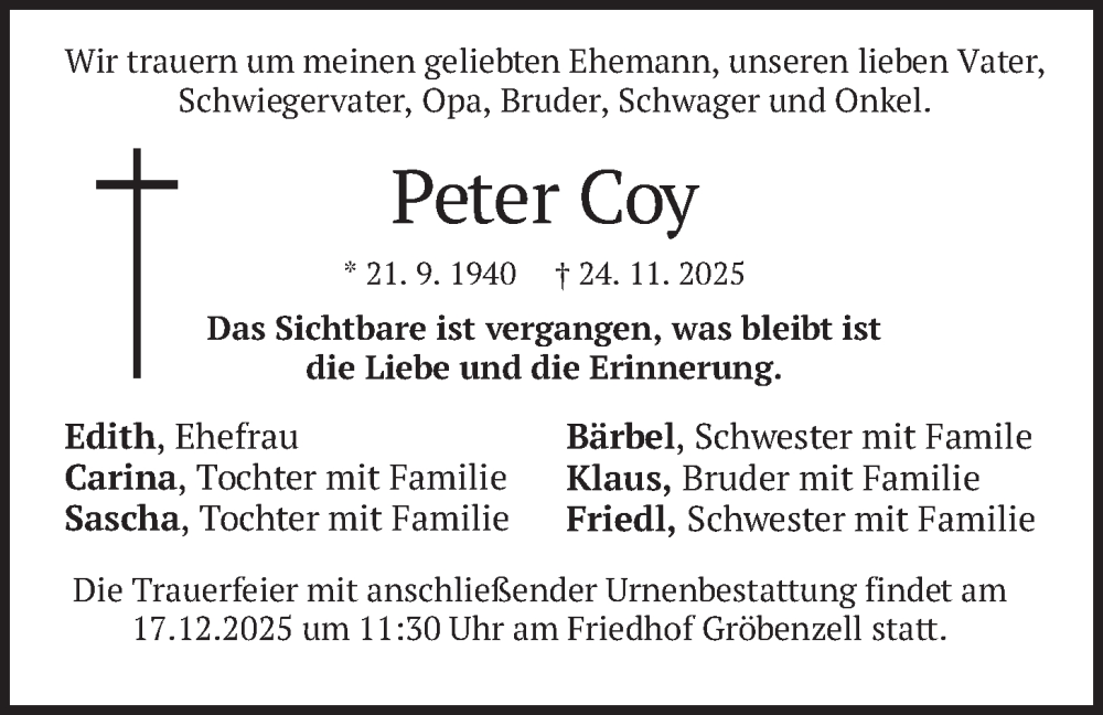 Hier finden Sie alle Traueranzeigen aus der Zeitung, die bisher für Peter Coy erschienen sind. Weitere Traueranzeigen, die in der Zeitung erscheinen, werden hier ebenfalls aufgelistet