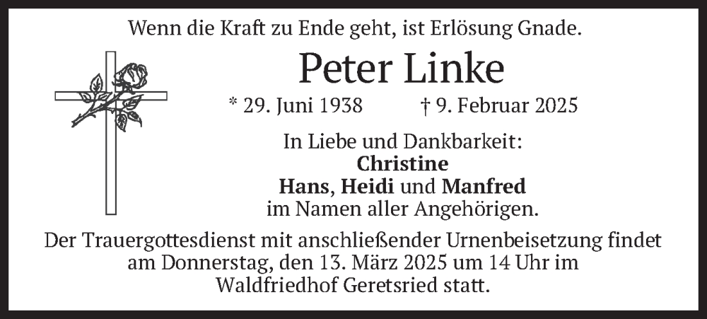 Hier finden Sie alle Traueranzeigen aus der Zeitung, die bisher für Peter Linke erschienen sind. Weitere Traueranzeigen, die in der Zeitung erscheinen, werden hier ebenfalls aufgelistet