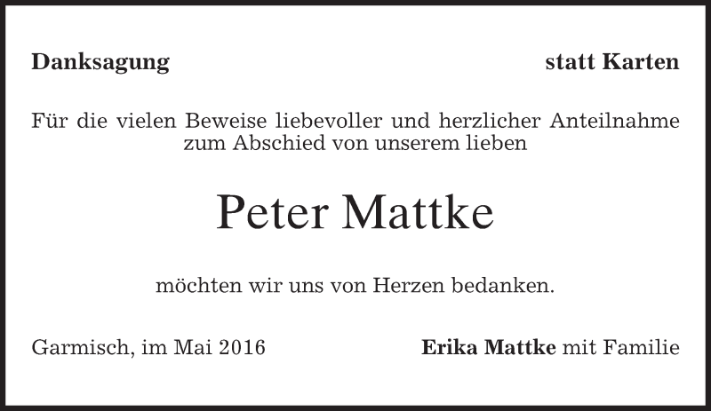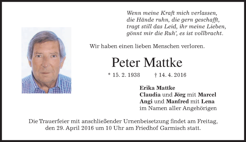 Hier finden Sie alle Traueranzeigen aus der Zeitung, die bisher für Peter Mattke erschienen sind. Weitere Traueranzeigen, die in der Zeitung erscheinen, werden hier ebenfalls aufgelistet