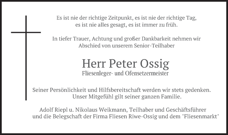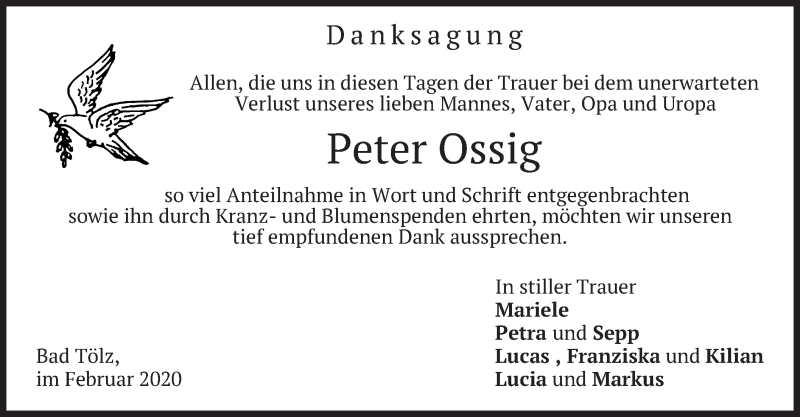 Hier finden Sie alle Traueranzeigen aus der Zeitung, die bisher für Peter Ossig erschienen sind. Weitere Traueranzeigen, die in der Zeitung erscheinen, werden hier ebenfalls aufgelistet