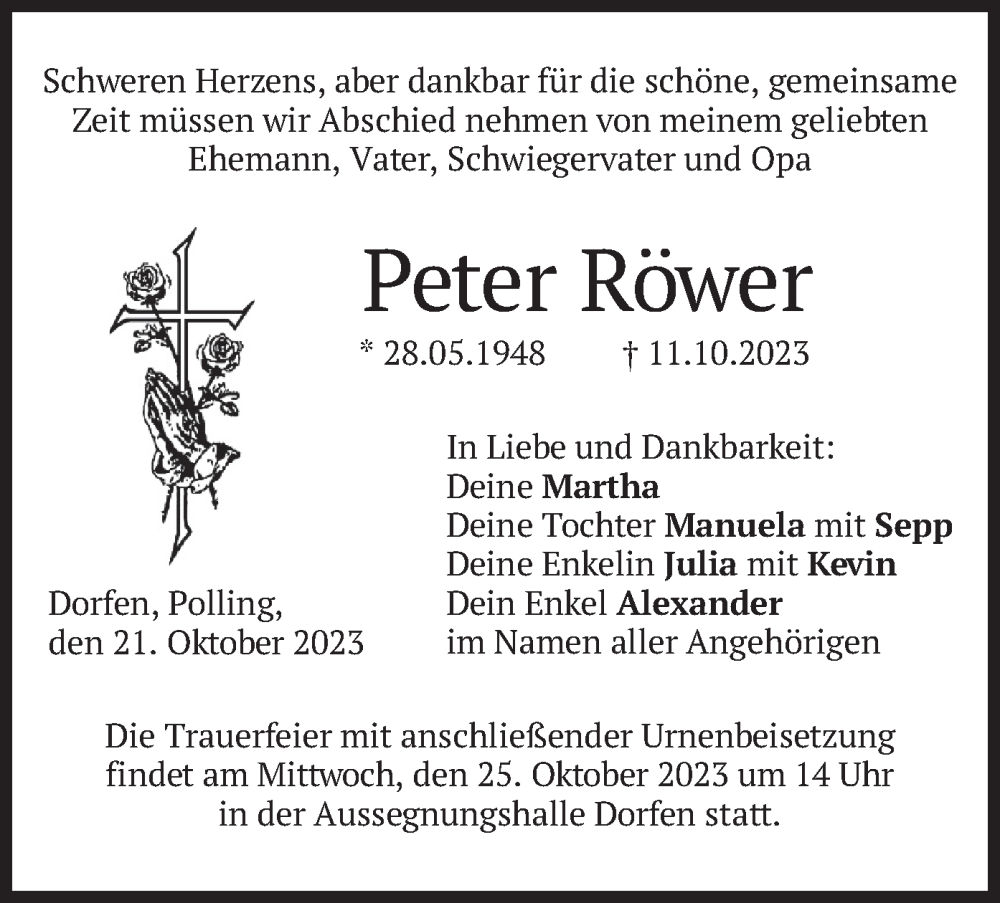 Hier finden Sie alle Traueranzeigen aus der Zeitung, die bisher für Peter Röwer erschienen sind. Weitere Traueranzeigen, die in der Zeitung erscheinen, werden hier ebenfalls aufgelistet