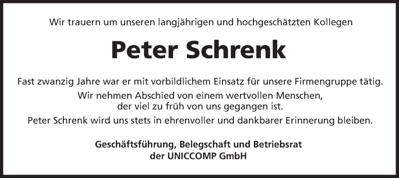 Hier finden Sie alle Traueranzeigen aus der Zeitung, die bisher für Peter Schrenk erschienen sind. Weitere Traueranzeigen, die in der Zeitung erscheinen, werden hier ebenfalls aufgelistet