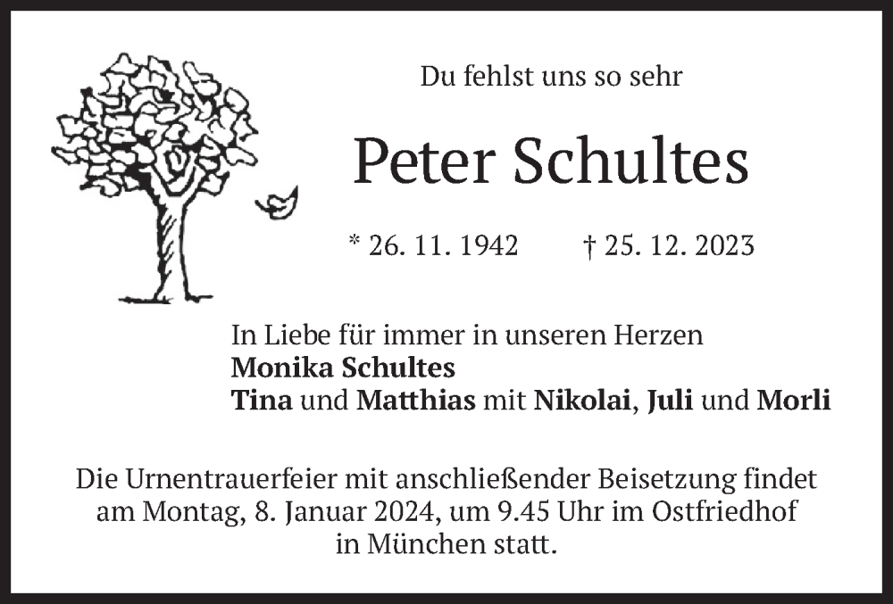 Hier finden Sie alle Traueranzeigen aus der Zeitung, die bisher für Peter Schultes erschienen sind. Weitere Traueranzeigen, die in der Zeitung erscheinen, werden hier ebenfalls aufgelistet