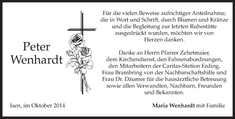 Hier finden Sie alle Traueranzeigen aus der Zeitung, die bisher für Peter Wenhardt erschienen sind. Weitere Traueranzeigen, die in der Zeitung erscheinen, werden hier ebenfalls aufgelistet