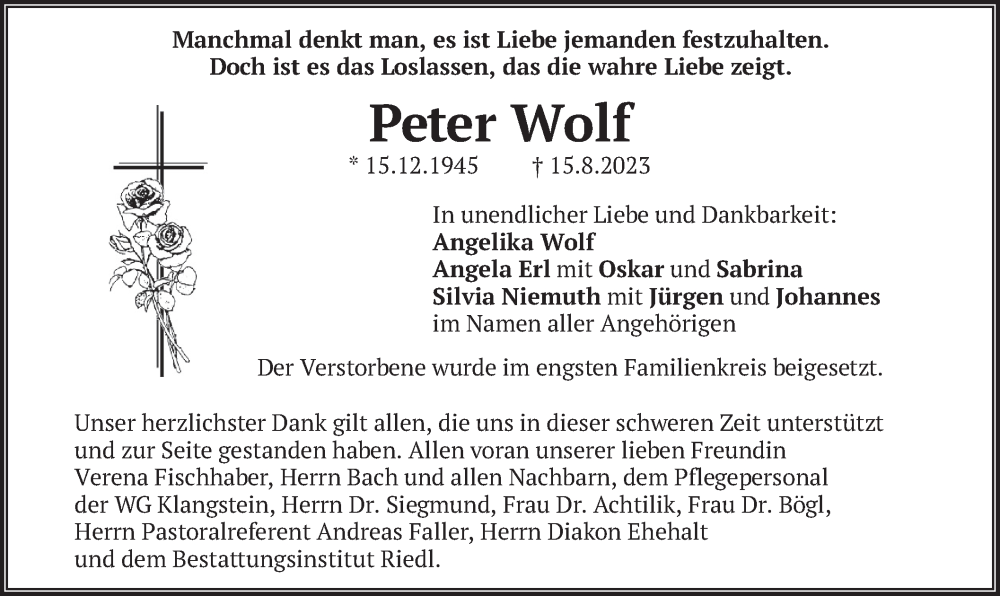 Hier finden Sie alle Traueranzeigen aus der Zeitung, die bisher für Peter Wolf erschienen sind. Weitere Traueranzeigen, die in der Zeitung erscheinen, werden hier ebenfalls aufgelistet