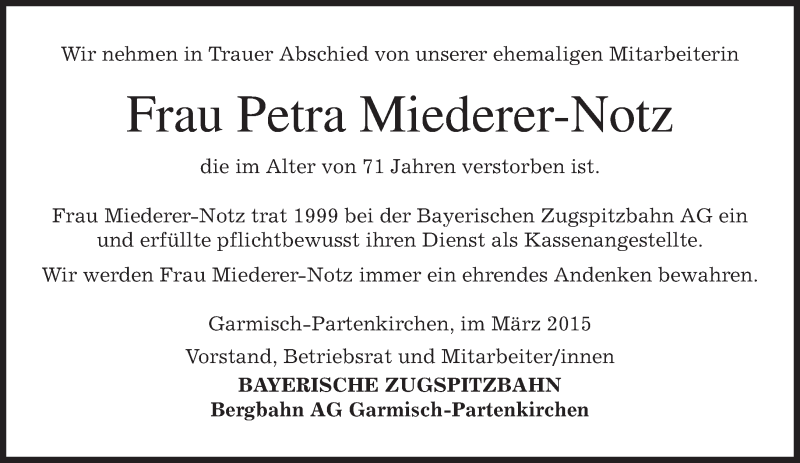 Hier finden Sie alle Traueranzeigen aus der Zeitung, die bisher für Petra Miederer-Notz erschienen sind. Weitere Traueranzeigen, die in der Zeitung erscheinen, werden hier ebenfalls aufgelistet