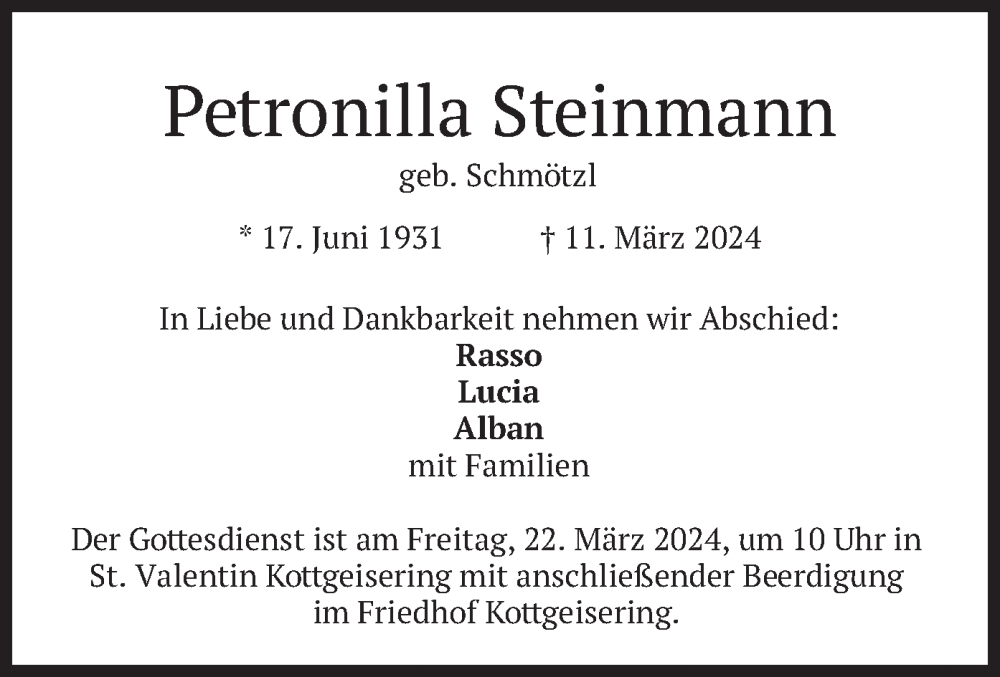 Hier finden Sie alle Traueranzeigen aus der Zeitung, die bisher für Petronilla Steinmann erschienen sind. Weitere Traueranzeigen, die in der Zeitung erscheinen, werden hier ebenfalls aufgelistet