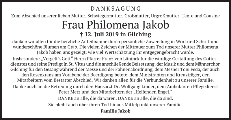 Hier finden Sie alle Traueranzeigen aus der Zeitung, die bisher für Philomena Jakob erschienen sind. Weitere Traueranzeigen, die in der Zeitung erscheinen, werden hier ebenfalls aufgelistet