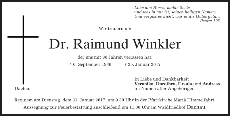 Hier finden Sie alle Traueranzeigen aus der Zeitung, die bisher für Raimund Winkler erschienen sind. Weitere Traueranzeigen, die in der Zeitung erscheinen, werden hier ebenfalls aufgelistet