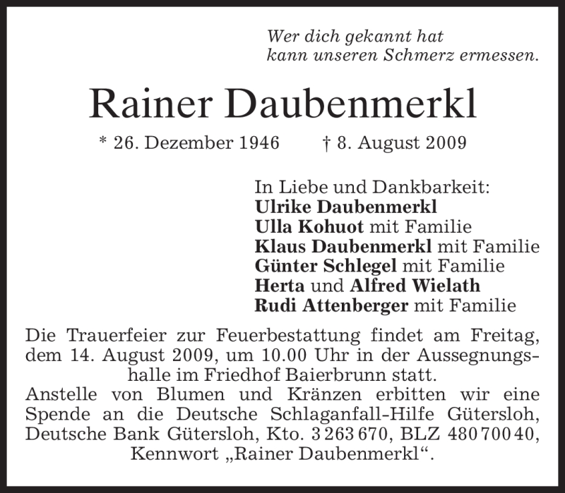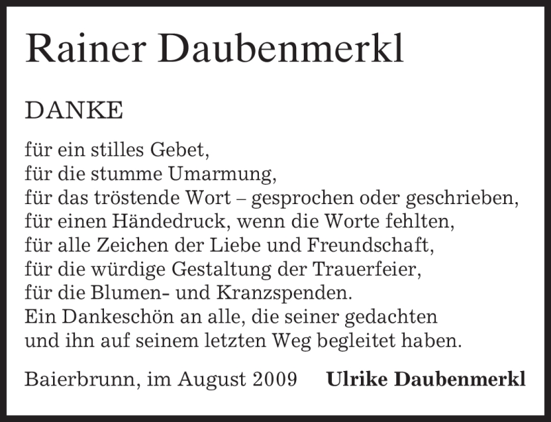 Hier finden Sie alle Traueranzeigen aus der Zeitung, die bisher für Rainer Daubenmerkl erschienen sind. Weitere Traueranzeigen, die in der Zeitung erscheinen, werden hier ebenfalls aufgelistet