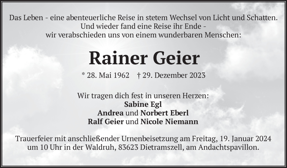 Hier finden Sie alle Traueranzeigen aus der Zeitung, die bisher für Rainer Geier erschienen sind. Weitere Traueranzeigen, die in der Zeitung erscheinen, werden hier ebenfalls aufgelistet