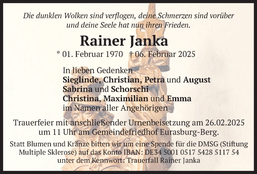 Hier finden Sie alle Traueranzeigen aus der Zeitung, die bisher für Rainer Janka erschienen sind. Weitere Traueranzeigen, die in der Zeitung erscheinen, werden hier ebenfalls aufgelistet
