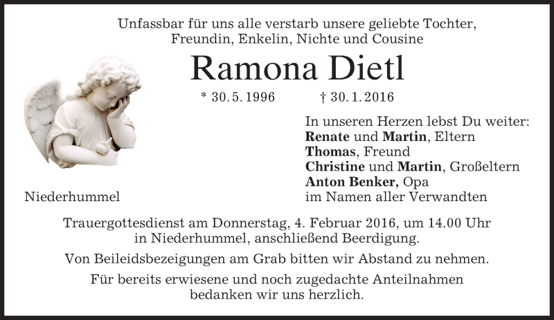 Hier finden Sie alle Traueranzeigen aus der Zeitung, die bisher für Ramona Dietl erschienen sind. Weitere Traueranzeigen, die in der Zeitung erscheinen, werden hier ebenfalls aufgelistet
