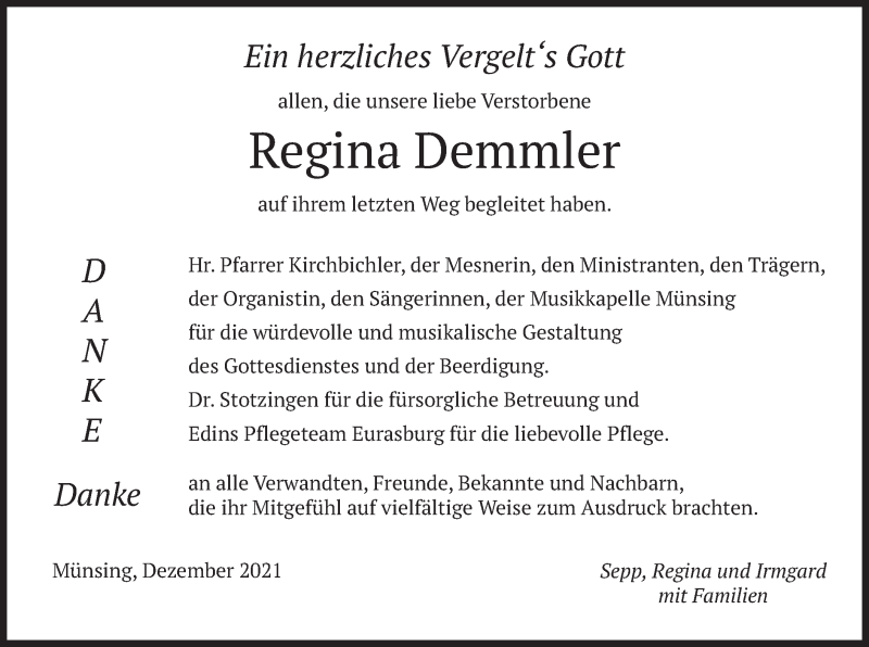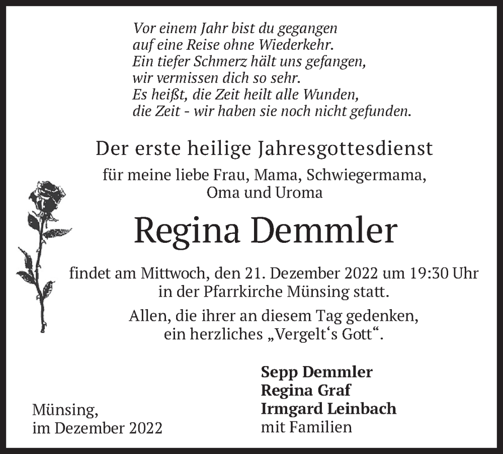 Hier finden Sie alle Traueranzeigen aus der Zeitung, die bisher für Regina Demmler erschienen sind. Weitere Traueranzeigen, die in der Zeitung erscheinen, werden hier ebenfalls aufgelistet