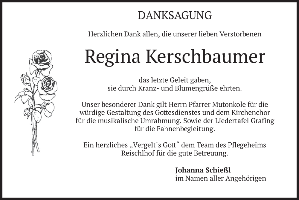 Hier finden Sie alle Traueranzeigen aus der Zeitung, die bisher für Regina Kerschbaumer erschienen sind. Weitere Traueranzeigen, die in der Zeitung erscheinen, werden hier ebenfalls aufgelistet