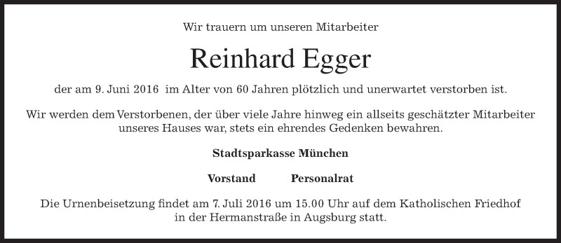 Hier finden Sie alle Traueranzeigen aus der Zeitung, die bisher für Reinhard Egger erschienen sind. Weitere Traueranzeigen, die in der Zeitung erscheinen, werden hier ebenfalls aufgelistet