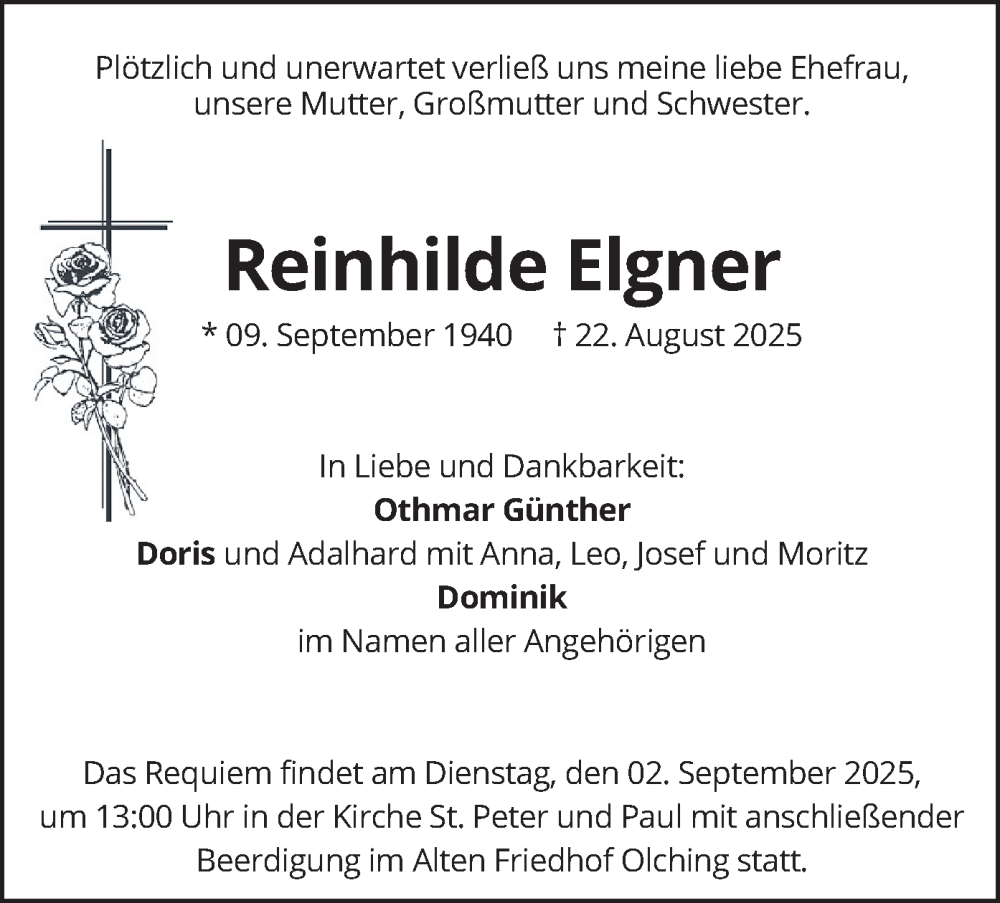 Hier finden Sie alle Traueranzeigen aus der Zeitung, die bisher für Reinhilde Elgner erschienen sind. Weitere Traueranzeigen, die in der Zeitung erscheinen, werden hier ebenfalls aufgelistet