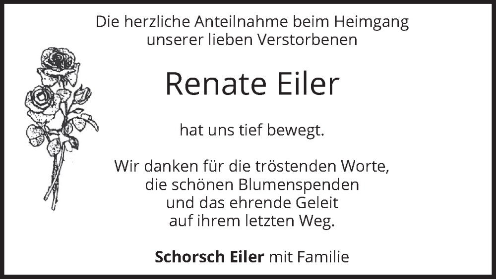 Hier finden Sie alle Traueranzeigen aus der Zeitung, die bisher für Renate Eiler erschienen sind. Weitere Traueranzeigen, die in der Zeitung erscheinen, werden hier ebenfalls aufgelistet