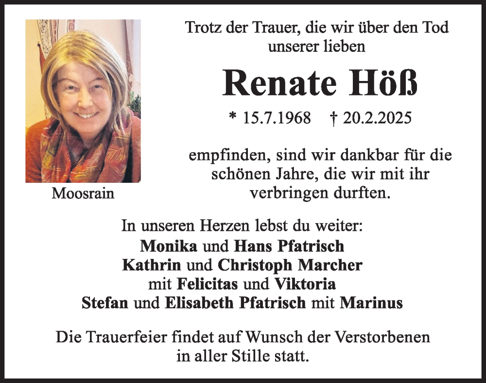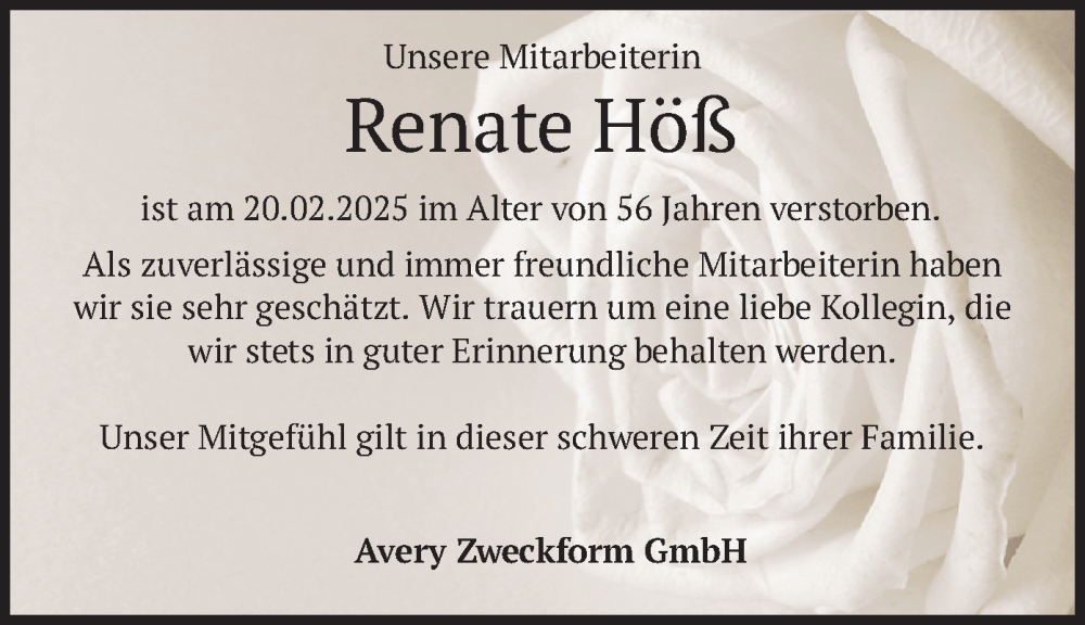 Hier finden Sie alle Traueranzeigen aus der Zeitung, die bisher für Renate Höß erschienen sind. Weitere Traueranzeigen, die in der Zeitung erscheinen, werden hier ebenfalls aufgelistet