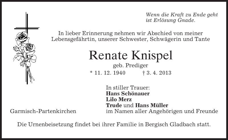 Hier finden Sie alle Traueranzeigen aus der Zeitung, die bisher für Renate Knispel erschienen sind. Weitere Traueranzeigen, die in der Zeitung erscheinen, werden hier ebenfalls aufgelistet