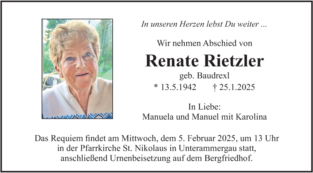 Hier finden Sie alle Traueranzeigen aus der Zeitung, die bisher für Renate Rietzler erschienen sind. Weitere Traueranzeigen, die in der Zeitung erscheinen, werden hier ebenfalls aufgelistet