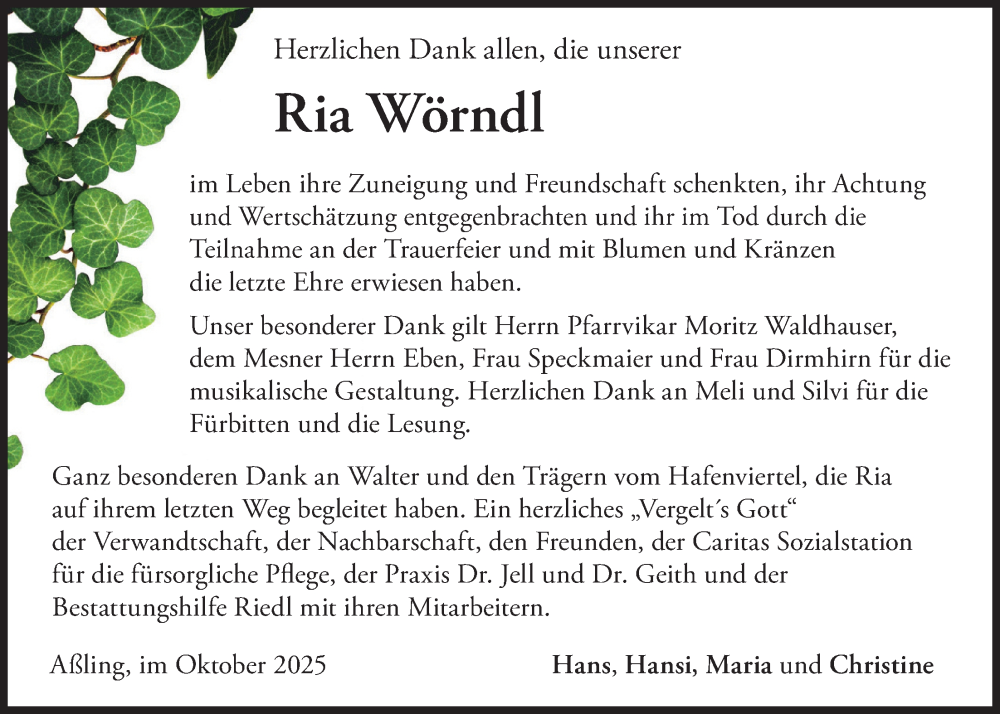 Hier finden Sie alle Traueranzeigen aus der Zeitung, die bisher für Ria Wörndl erschienen sind. Weitere Traueranzeigen, die in der Zeitung erscheinen, werden hier ebenfalls aufgelistet