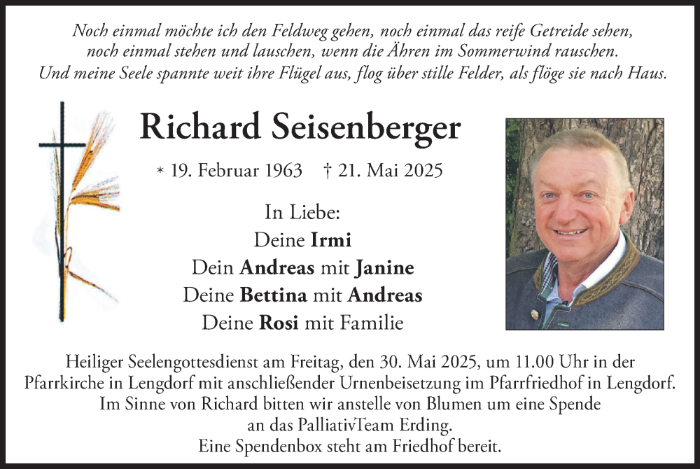 Hier finden Sie alle Traueranzeigen aus der Zeitung, die bisher für Richard Seisenberger erschienen sind. Weitere Traueranzeigen, die in der Zeitung erscheinen, werden hier ebenfalls aufgelistet