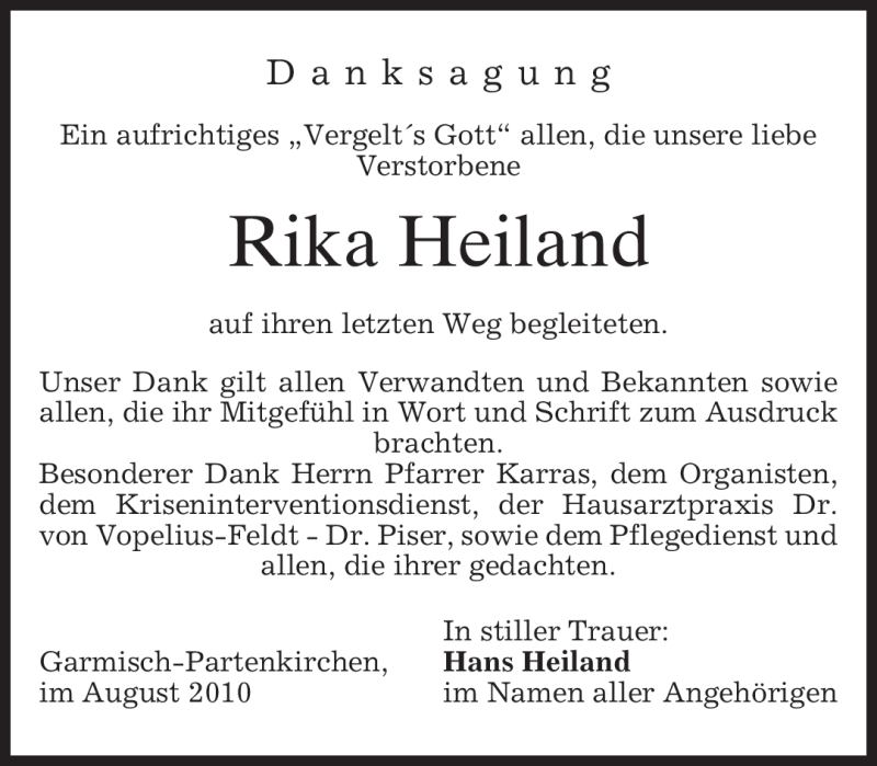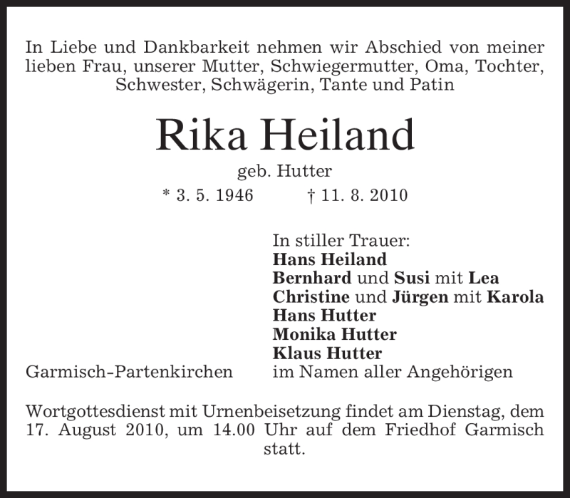 Hier finden Sie alle Traueranzeigen aus der Zeitung, die bisher für Rika Heiland erschienen sind. Weitere Traueranzeigen, die in der Zeitung erscheinen, werden hier ebenfalls aufgelistet