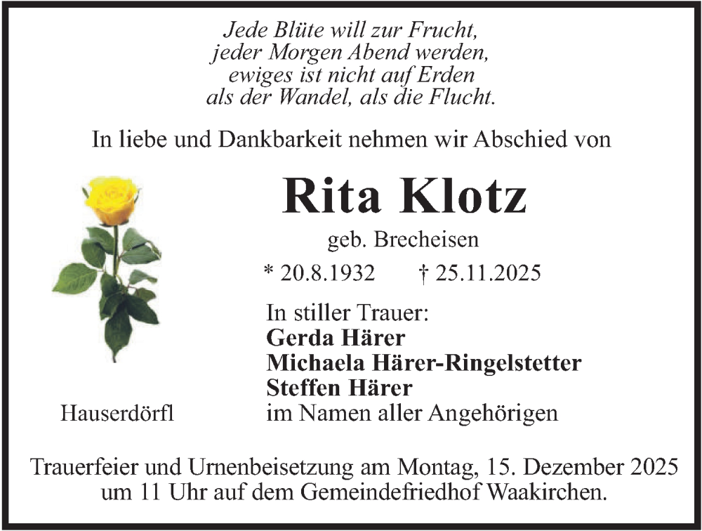 Hier finden Sie alle Traueranzeigen aus der Zeitung, die bisher für Rita Klotz erschienen sind. Weitere Traueranzeigen, die in der Zeitung erscheinen, werden hier ebenfalls aufgelistet