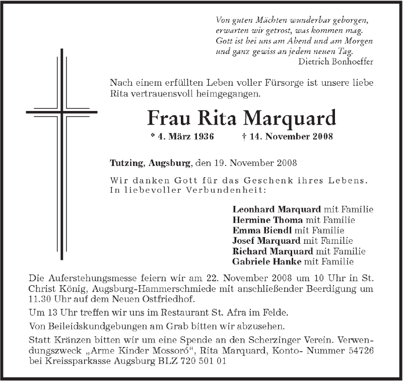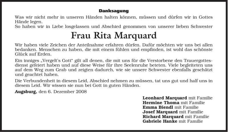 Hier finden Sie alle Traueranzeigen aus der Zeitung, die bisher für Rita Marquard erschienen sind. Weitere Traueranzeigen, die in der Zeitung erscheinen, werden hier ebenfalls aufgelistet