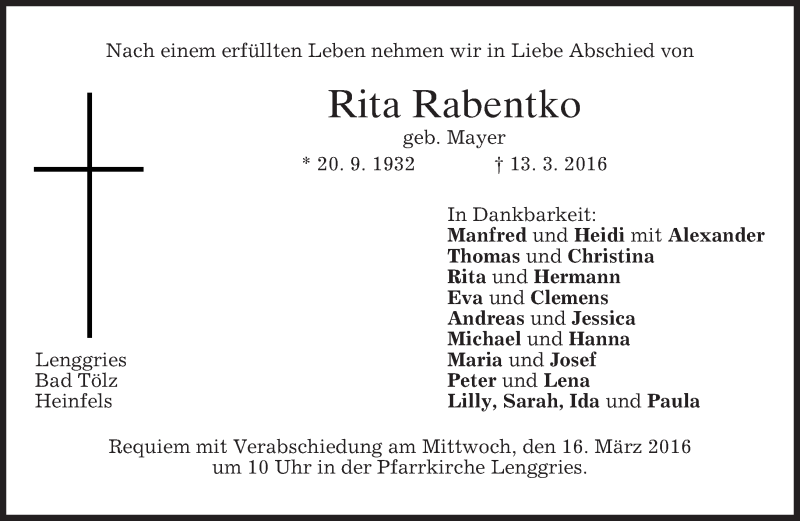Hier finden Sie alle Traueranzeigen aus der Zeitung, die bisher für Rita Rabentko erschienen sind. Weitere Traueranzeigen, die in der Zeitung erscheinen, werden hier ebenfalls aufgelistet