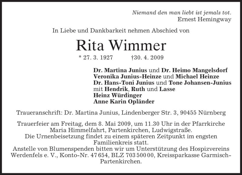 Hier finden Sie alle Traueranzeigen aus der Zeitung, die bisher für Rita Wimmer erschienen sind. Weitere Traueranzeigen, die in der Zeitung erscheinen, werden hier ebenfalls aufgelistet