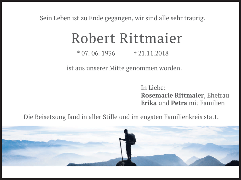 Hier finden Sie alle Traueranzeigen aus der Zeitung, die bisher für Robert Rittmaier erschienen sind. Weitere Traueranzeigen, die in der Zeitung erscheinen, werden hier ebenfalls aufgelistet