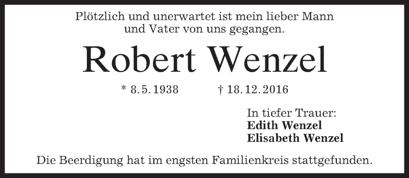 Hier finden Sie alle Traueranzeigen aus der Zeitung, die bisher für Robert Wenzel erschienen sind. Weitere Traueranzeigen, die in der Zeitung erscheinen, werden hier ebenfalls aufgelistet