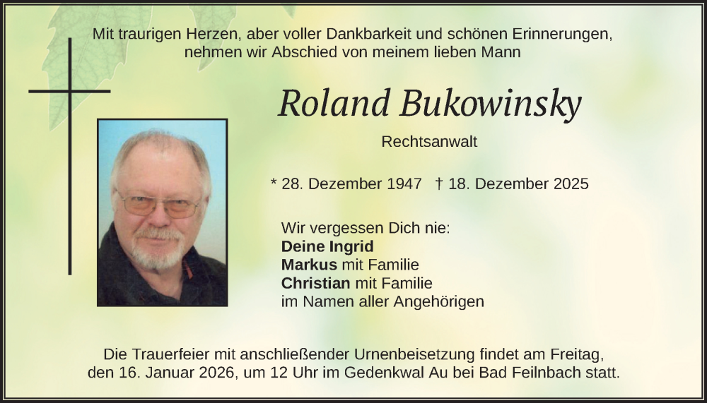 Hier finden Sie alle Traueranzeigen aus der Zeitung, die bisher für Roland Bukowinsky erschienen sind. Weitere Traueranzeigen, die in der Zeitung erscheinen, werden hier ebenfalls aufgelistet