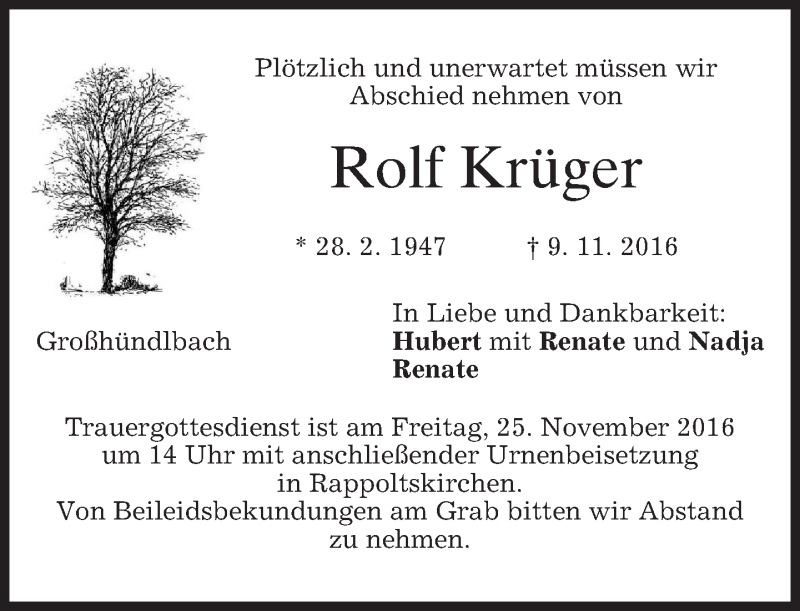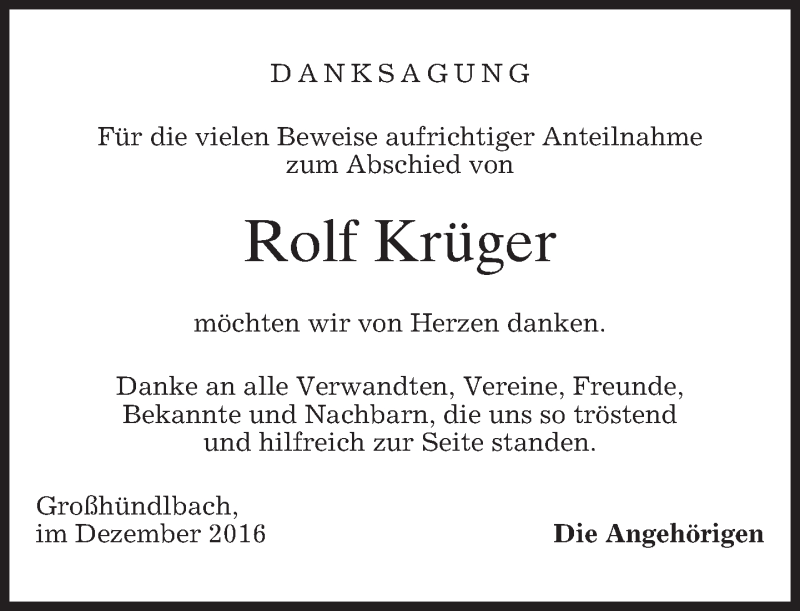 Hier finden Sie alle Traueranzeigen aus der Zeitung, die bisher für Rolf Krüger erschienen sind. Weitere Traueranzeigen, die in der Zeitung erscheinen, werden hier ebenfalls aufgelistet