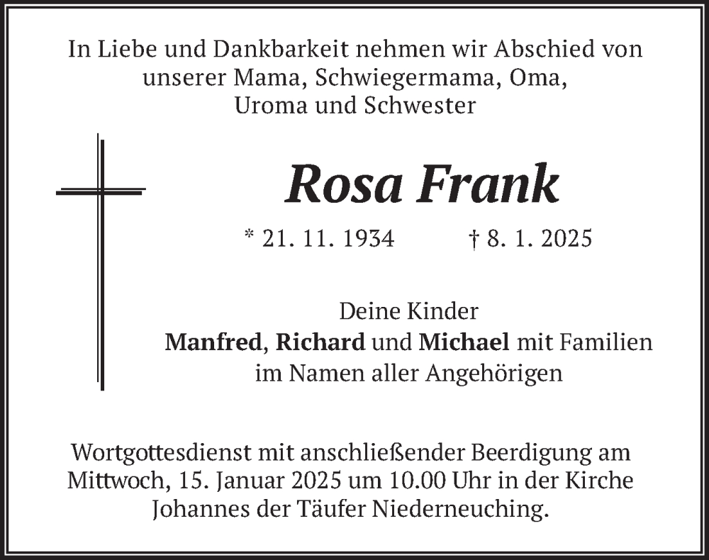 Hier finden Sie alle Traueranzeigen aus der Zeitung, die bisher für Rosa Frank erschienen sind. Weitere Traueranzeigen, die in der Zeitung erscheinen, werden hier ebenfalls aufgelistet