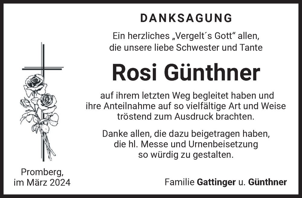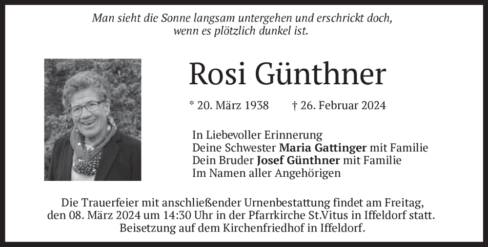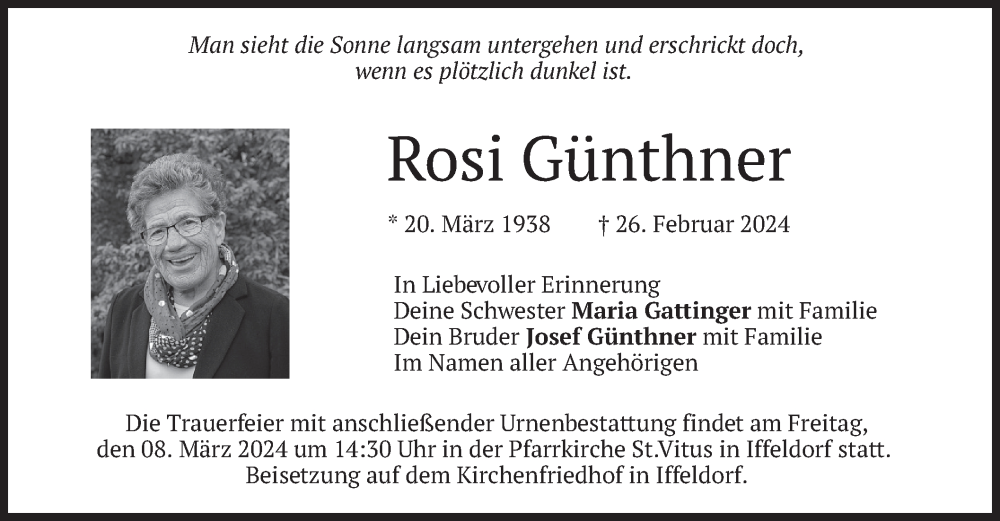 Hier finden Sie alle Traueranzeigen aus der Zeitung, die bisher für Rosi Günthner erschienen sind. Weitere Traueranzeigen, die in der Zeitung erscheinen, werden hier ebenfalls aufgelistet