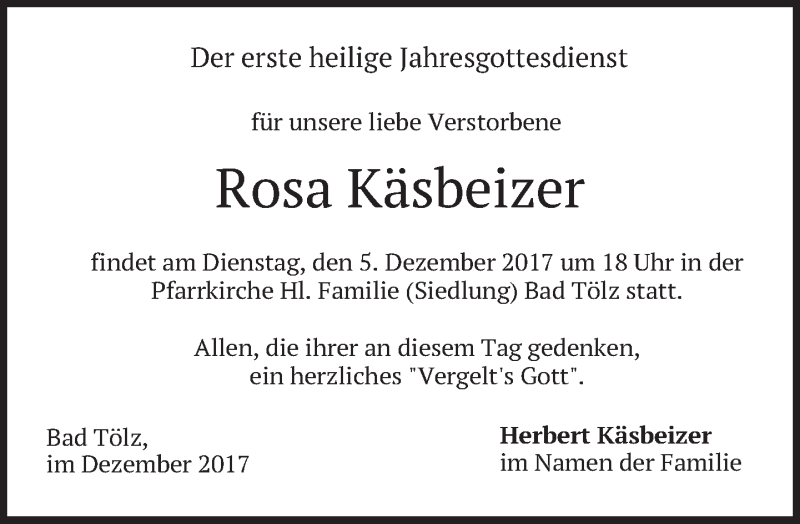 Hier finden Sie alle Traueranzeigen aus der Zeitung, die bisher für Rosa Käsbeizer erschienen sind. Weitere Traueranzeigen, die in der Zeitung erscheinen, werden hier ebenfalls aufgelistet
