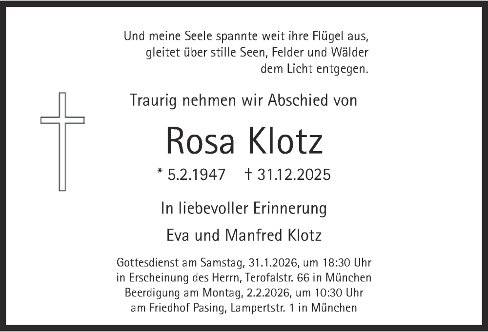 Hier finden Sie alle Traueranzeigen aus der Zeitung, die bisher für Rosa Klotz erschienen sind. Weitere Traueranzeigen, die in der Zeitung erscheinen, werden hier ebenfalls aufgelistet