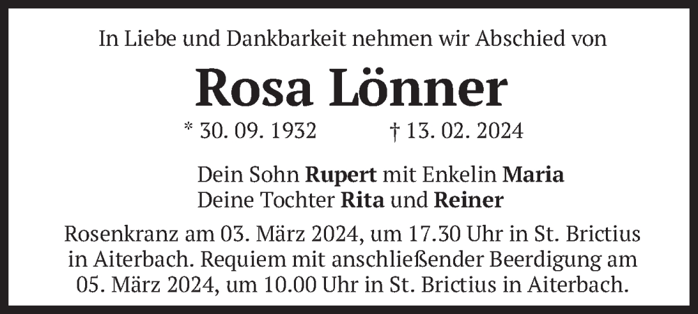 Hier finden Sie alle Traueranzeigen aus der Zeitung, die bisher für Rosa Lönner erschienen sind. Weitere Traueranzeigen, die in der Zeitung erscheinen, werden hier ebenfalls aufgelistet