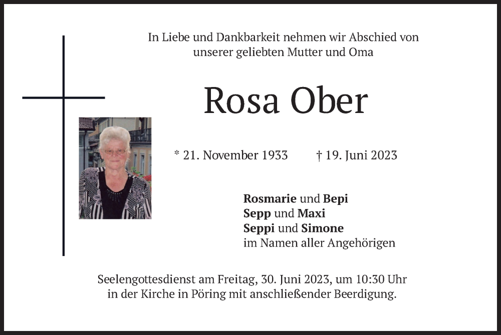 Hier finden Sie alle Traueranzeigen aus der Zeitung, die bisher für Rosa Ober erschienen sind. Weitere Traueranzeigen, die in der Zeitung erscheinen, werden hier ebenfalls aufgelistet