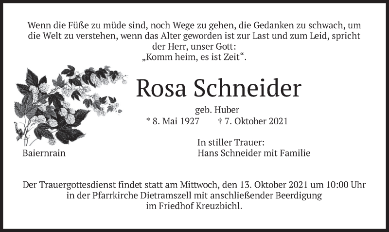 Hier finden Sie alle Traueranzeigen aus der Zeitung, die bisher für Rosa Schneider erschienen sind. Weitere Traueranzeigen, die in der Zeitung erscheinen, werden hier ebenfalls aufgelistet