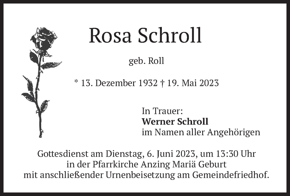 Hier finden Sie alle Traueranzeigen aus der Zeitung, die bisher für Rosa Schroll erschienen sind. Weitere Traueranzeigen, die in der Zeitung erscheinen, werden hier ebenfalls aufgelistet