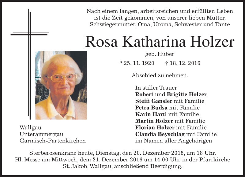 Hier finden Sie alle Traueranzeigen aus der Zeitung, die bisher für Rosa Katharina Holzer erschienen sind. Weitere Traueranzeigen, die in der Zeitung erscheinen, werden hier ebenfalls aufgelistet