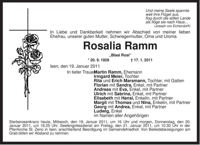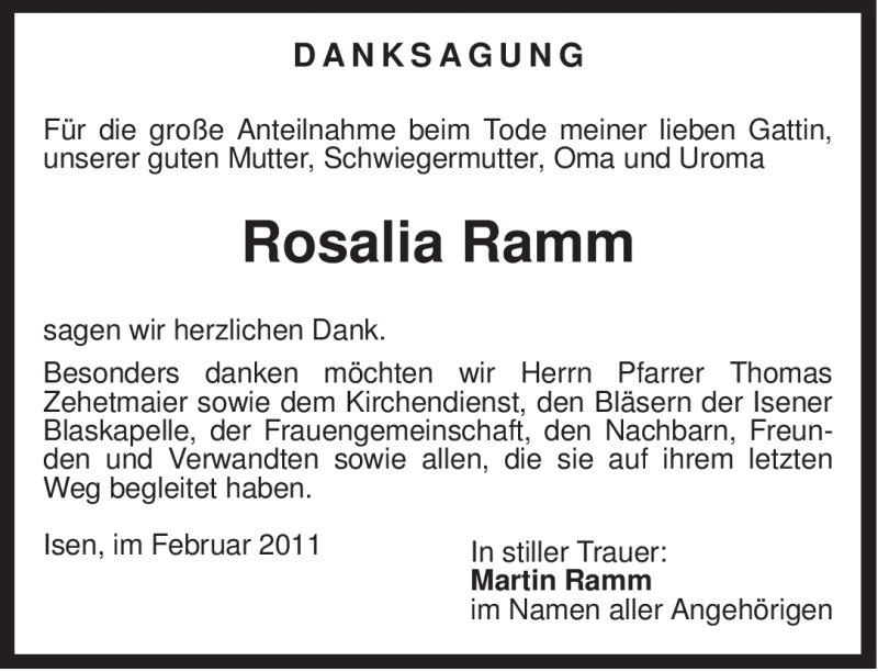 Hier finden Sie alle Traueranzeigen aus der Zeitung, die bisher für Rosalia Ramm erschienen sind. Weitere Traueranzeigen, die in der Zeitung erscheinen, werden hier ebenfalls aufgelistet