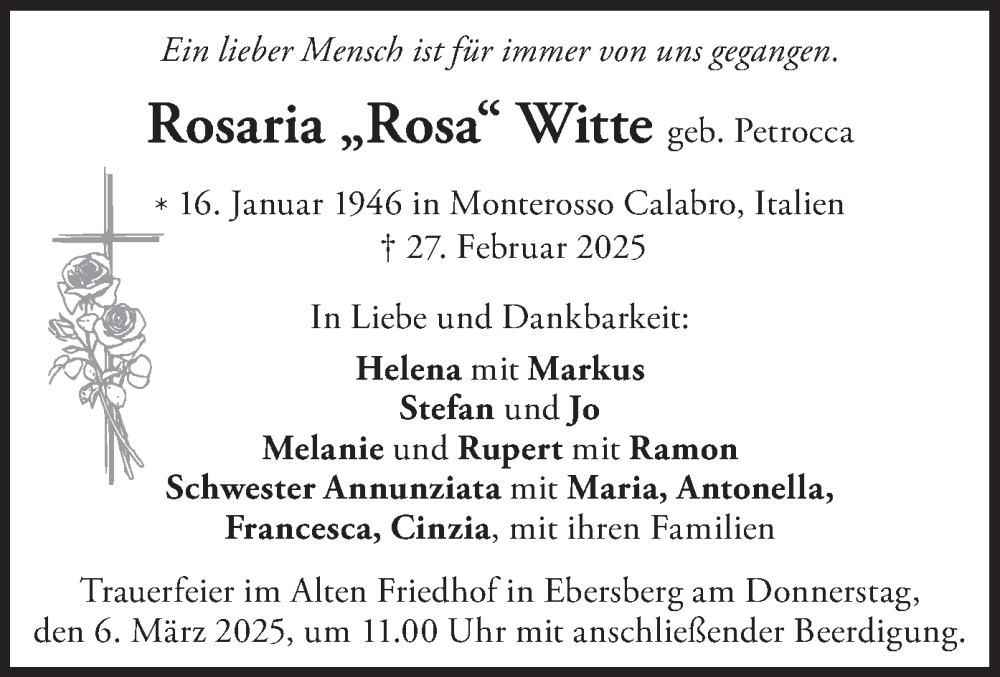 Hier finden Sie alle Traueranzeigen aus der Zeitung, die bisher für Rosaria Witte erschienen sind. Weitere Traueranzeigen, die in der Zeitung erscheinen, werden hier ebenfalls aufgelistet